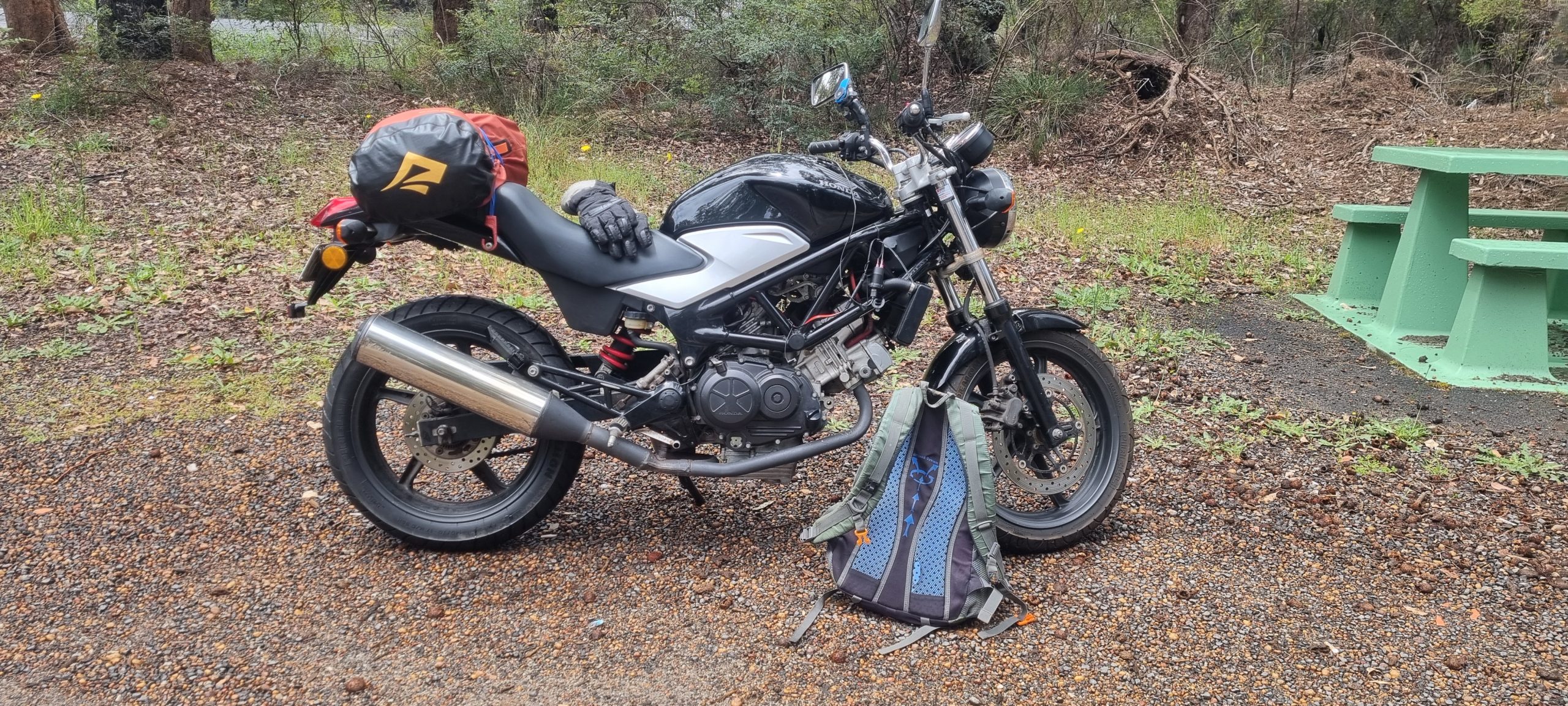Dump bags and head for Jimmy’s where the bike will live till Linda gets back  from her trip. Uber taxi back to Jenny. Next step is to buy a bigger bag to take motorcycle kit in….tomorrow.