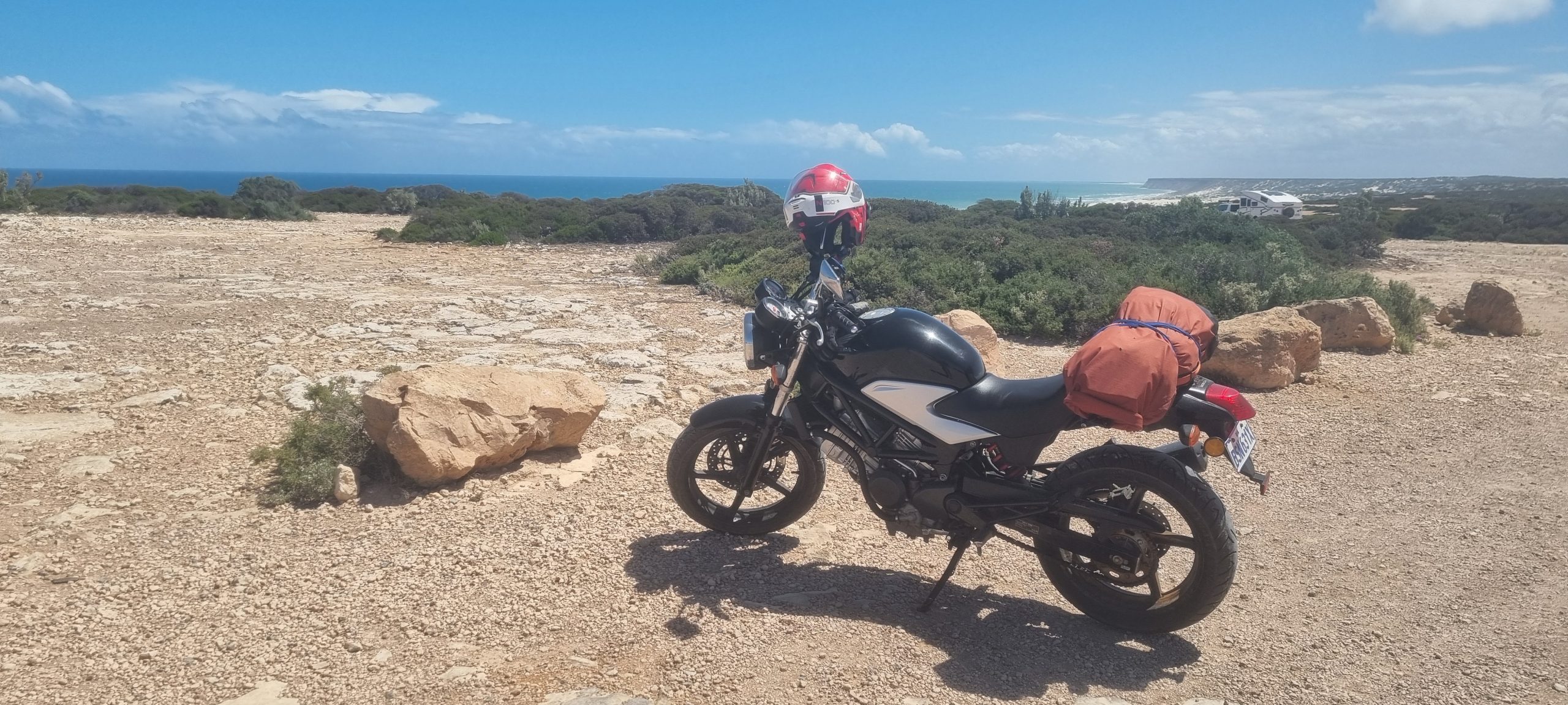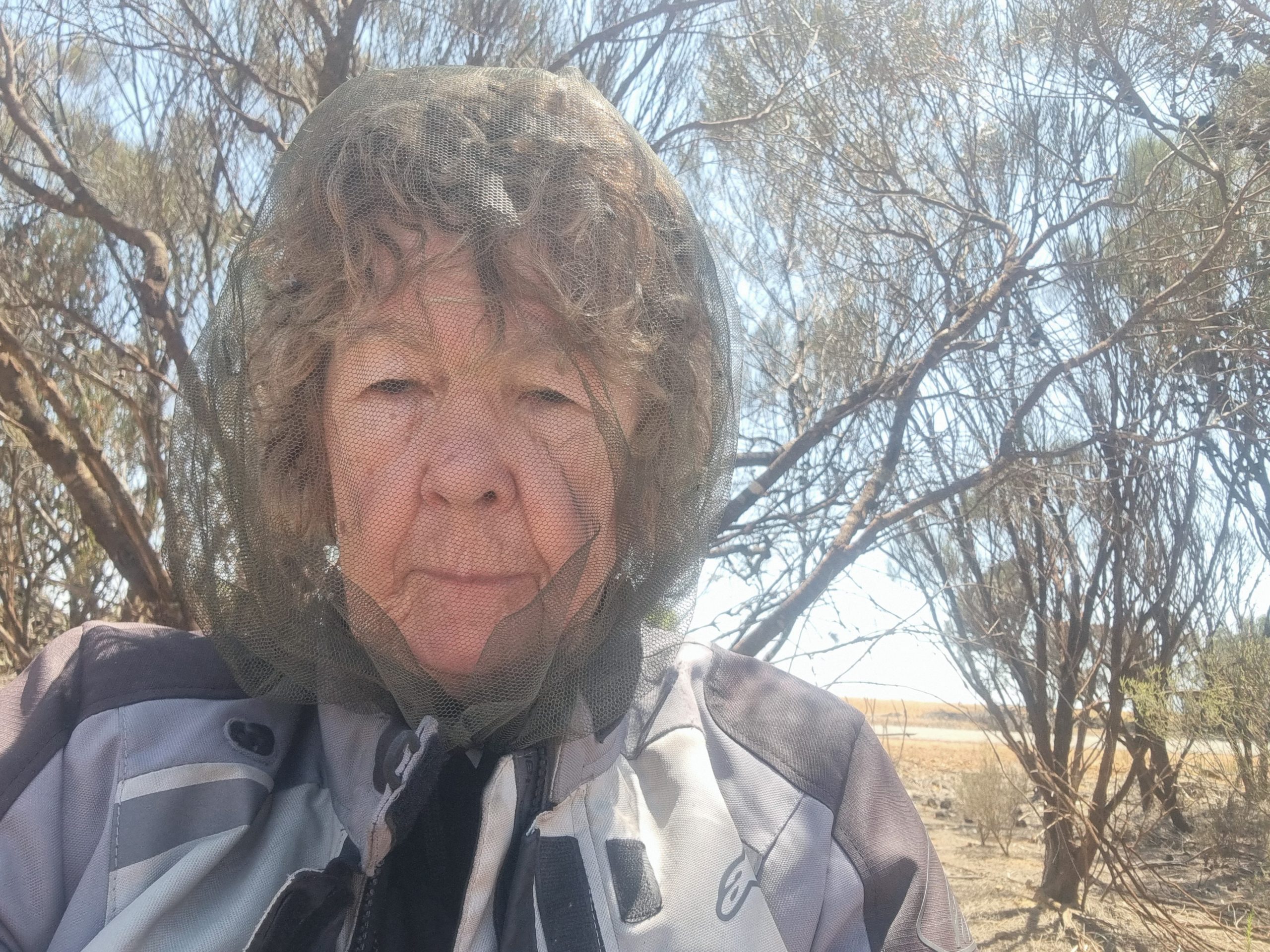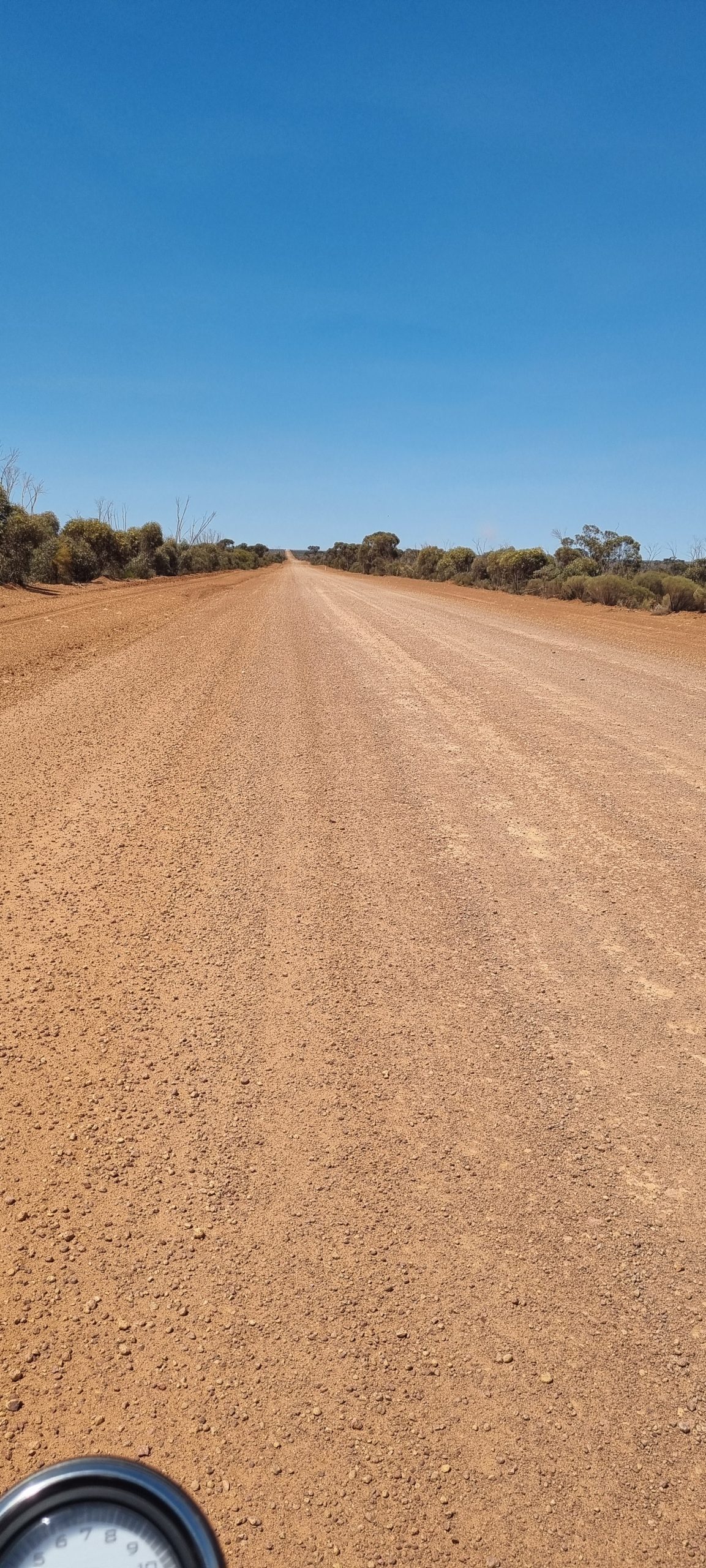 I have set myself a big day 480kms. Weather is cool but okay.Rain threatens a bit. Frequent stops are required, both long and short. Throttle wrist/hand does get it a bit. Have strapped a stick to the handle bar grip to help traction !! Crossed border between WA and SA. Lose an hour there so arrive about 5.30pm…a bit late..