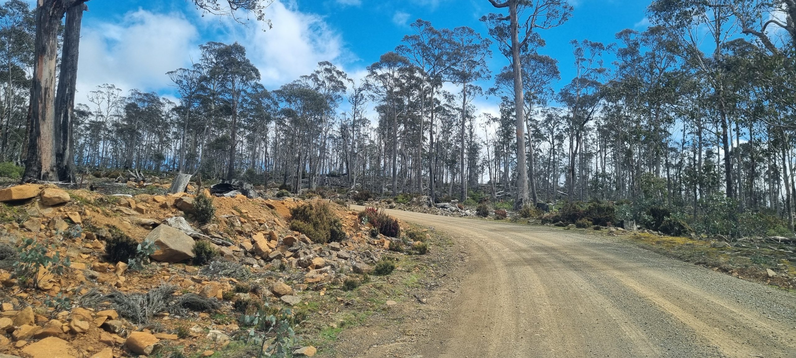 Another  driving day. It is raining  fair amount. Drive to Smithton….takes 2 hours. I began at 8am after good stay in last spot. Met Geoff Archie. I had met him on a trip in India last Feb. We had a cup of tea/coffee.  He said I must see Stanley so back tracked 20 kms. Large rock  and nice town with old houses and heritage. But need to make tracks south…find nice roads until bonk…its a gravel road. Quite a long way….about 100kms. Its pretty gravely  and very much up and down. The rain and wind lashing at times….the dirt road is not dry. Find a lady cyclist…is she okay?…ah yes, she has her pants down!!! Further on there is another , male ,cyclist struggling up a hill….it is steep and rough. I later am told it is a multi day race…super tough..