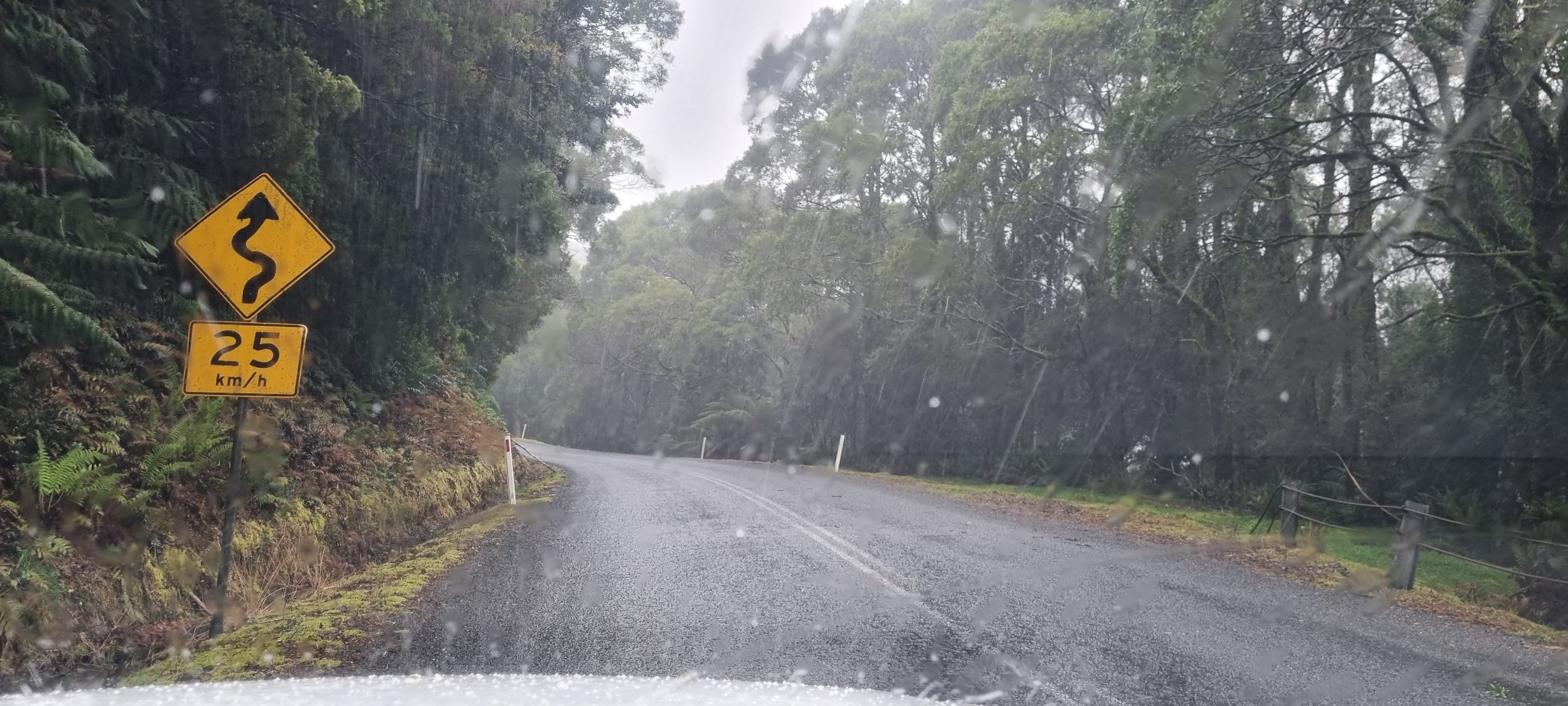 As Geoff had said I need to see Strahan I went down the only road to it leaving Queenstown at 8am.  It was quite touristy and I could see the attraction especially the I day cruise up the Gordon river. But no time for me and it was back up the very bendy road and onwards. Climbed away from Queenstown…old mining town…up and up. The rain lashed and the wind blew. As ever few cars even though this is a tourist route. The rain became snow as the temperature dropped and altitude was gained up in the Central  Highlands again. It was about 800m . Amazing forests on this side of the island. And very wet normally…not just today. Queenstown averages 94 ins per year !. Stop in a cafe…very few..at Derwent Bridge. There was something to see here but not in this weather.Two cyclists in the cafe drying their clothes by the fire. They were having a miserable time.